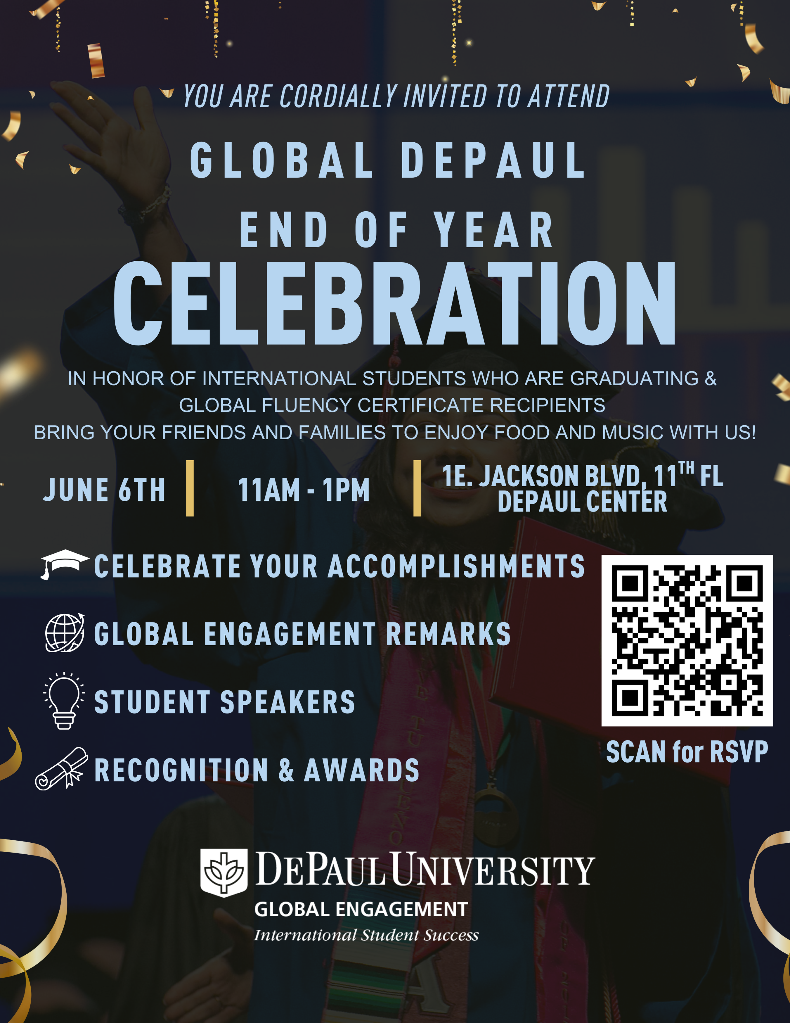 Come celebrate your accomplishments with us! The Global DePaul End of Year Celebration is a special event recognizing international students who are graduating and recipients of the Global Fluency Certificate. This milestone celebration is a time to reflect on your accomplishments, share your journey with friends and family, and look forward to the exciting path ahead. We encourage you to bring your loved ones and celebrate this meaningful moment together. Let’s mark the end of the academic year with joy, pride, and community!