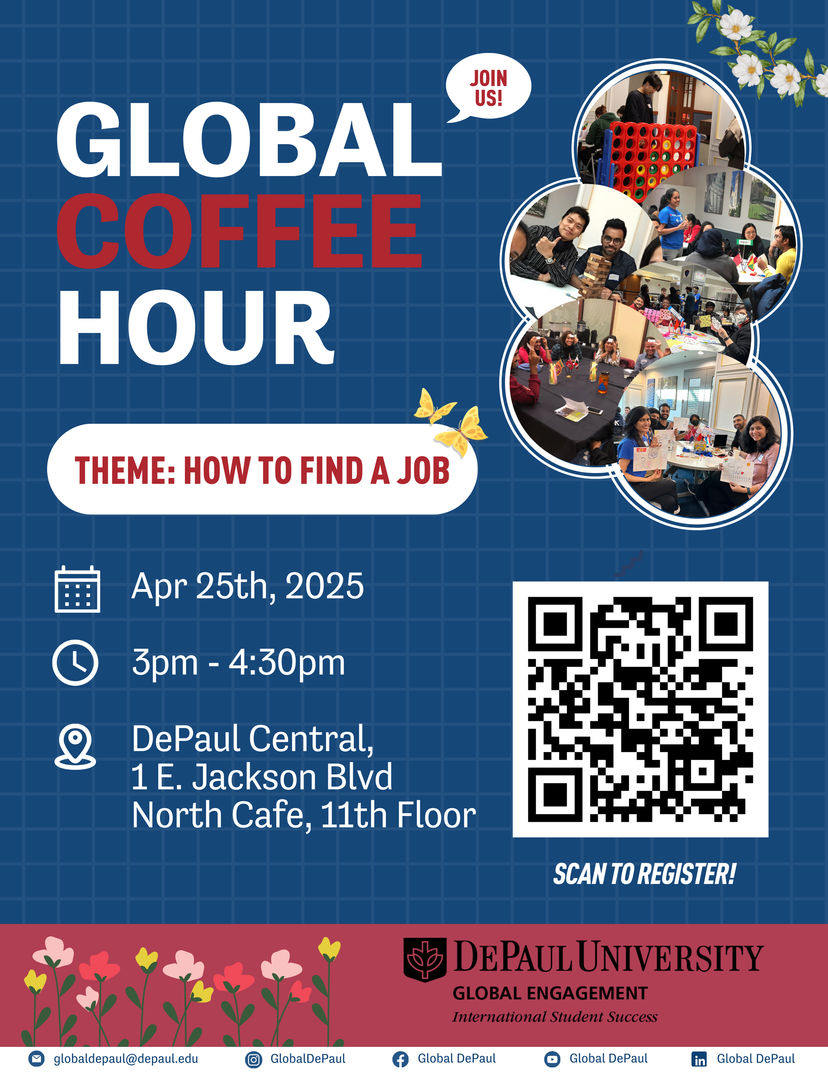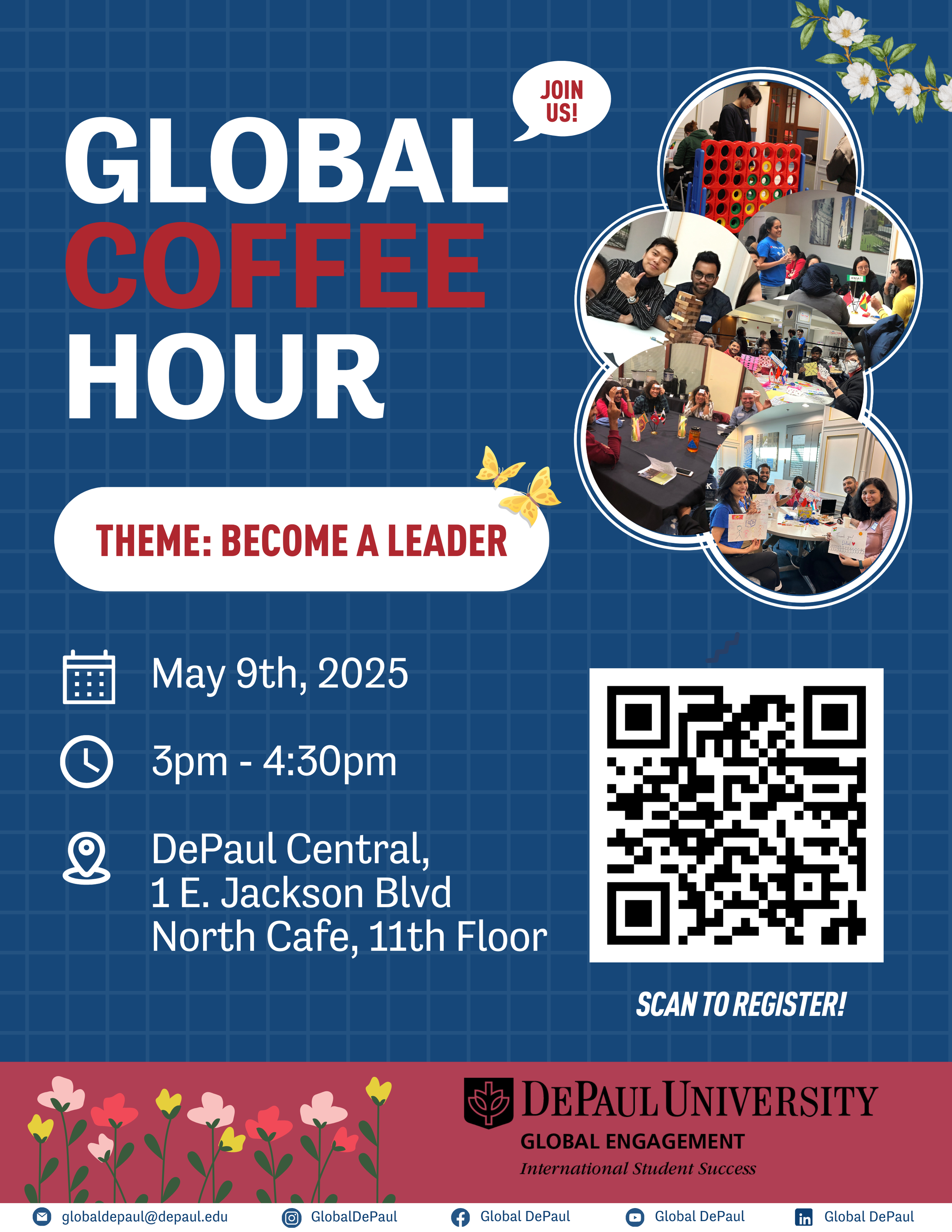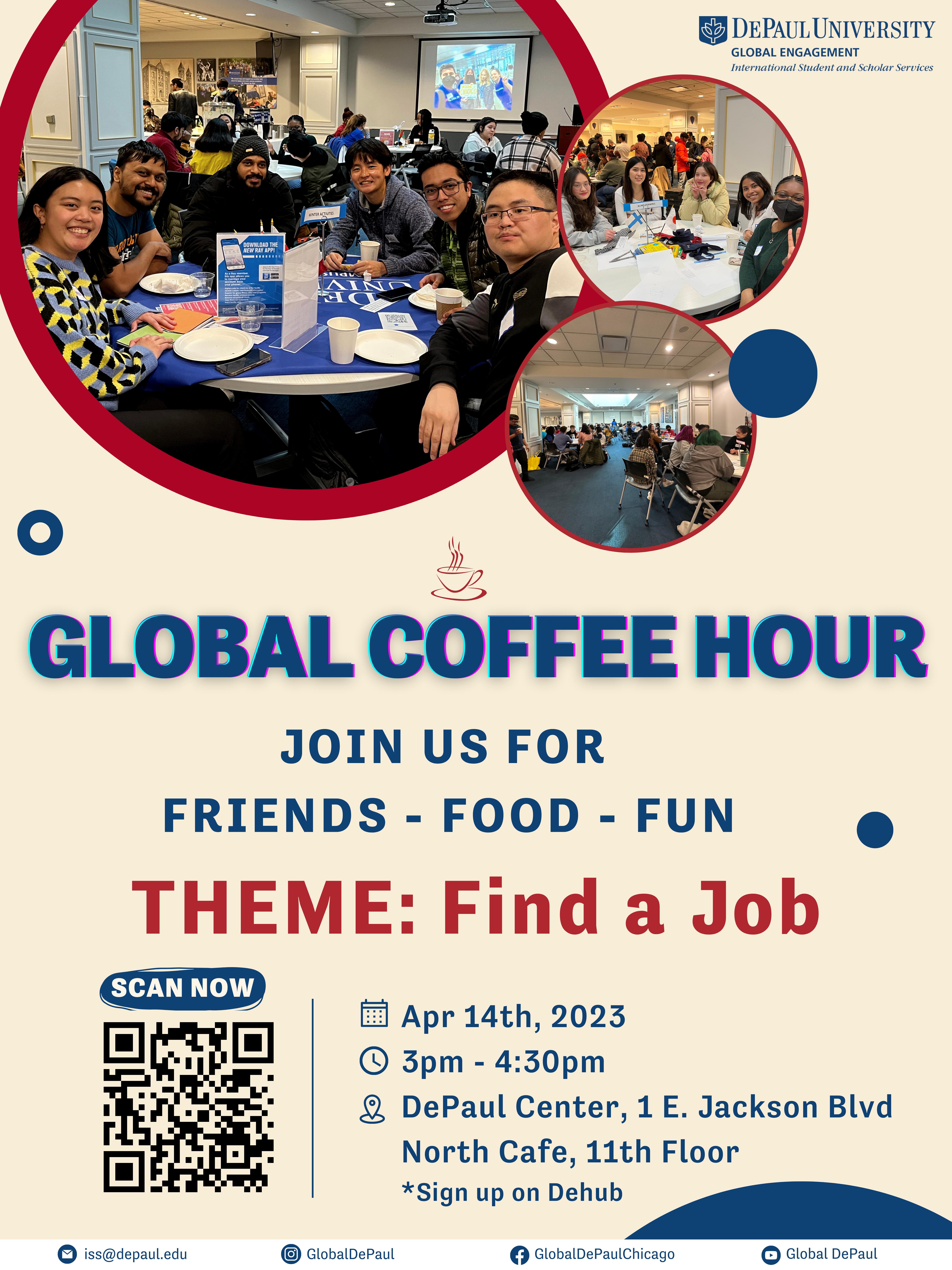 At this Global Coffee Hour, you'll meet other students, play interactive, cross-cultural games and have small group discussions about exploring Chicago - the food, the fun, and the cultures that make the Windy City so amazing.