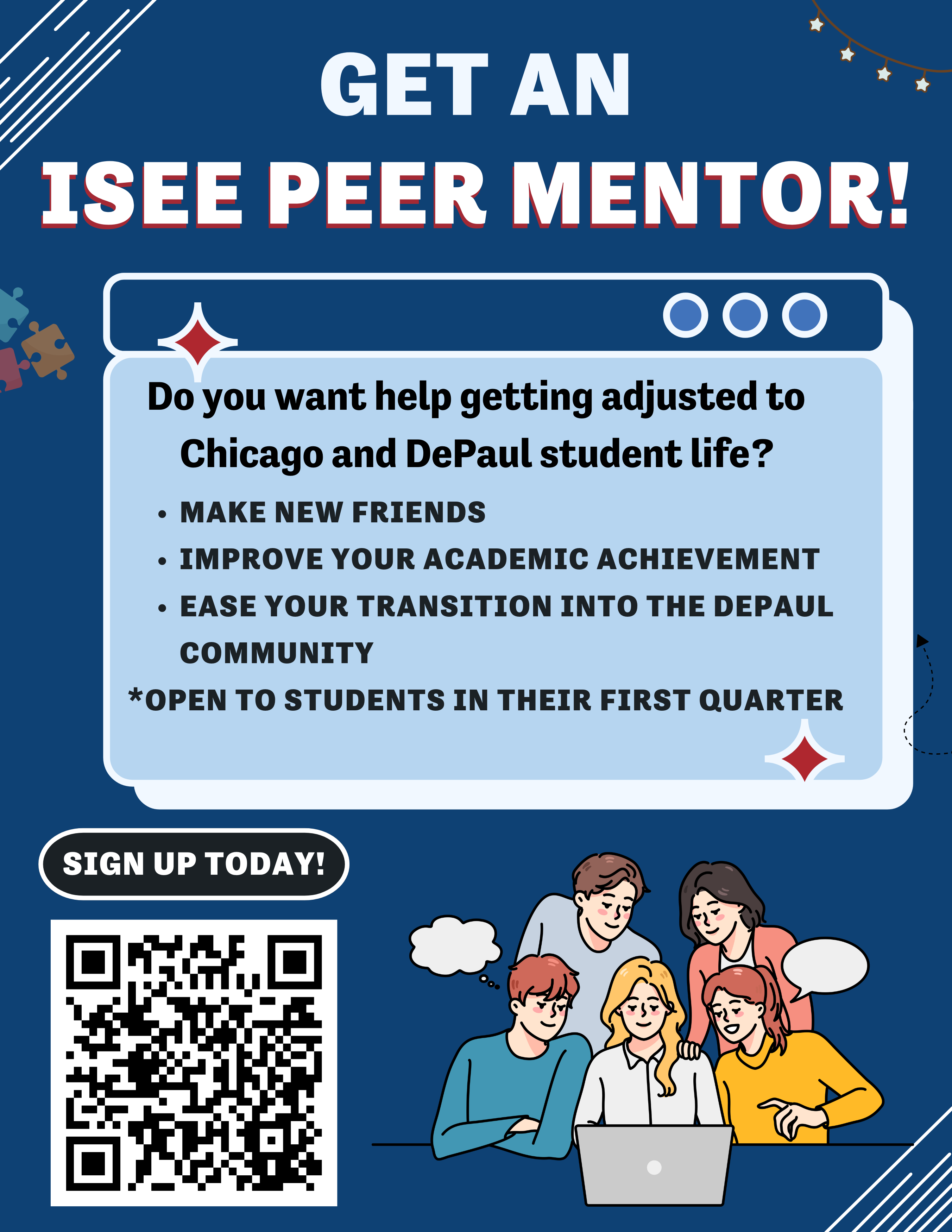 - ISEE Peer Mentor Program is open to new international students in their first quarter. If you sign up, you will be matched with a group of other new students and will have 1-2 peer mentors in the group with you to help answer questions and support you as you explore DePaul resources and learn how to be a successful DePaul student.
